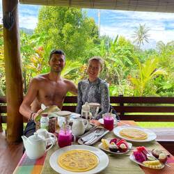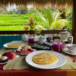 Ich bin morgens trotzdem früh wach und genieße mein Buch in der Hängematte auf der Veranda 🫶 Nach unserer Yogastunde wird uns auch schon das Frühstück serviert … Hach, so lässt es sich leben 😍 Und was gibt es heute? Jawoll: Pfannkuchen 🥞😅