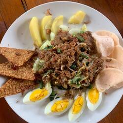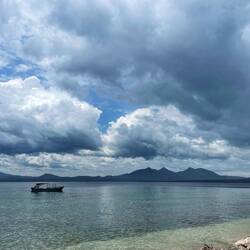 So geht es nach dem Frühstück zu „Tiaras Homestay“, welches hingegen dem Apel Homestay einer Ruheoase gleicht 🤫 Einfach, aber vollkommen ausreichend. Tiara bietet uns ebenfalls die Tour an und wir vergleichen nochmal alle Preise am Strand. Letztendlich sehen wir wirklich kein günstigeres Angebot und buchen abends die Tour für den letzten Tag in unserer ersten Unterkunft. In einem hervorragenden Restaurant „Warung D'BUCU“, mal wieder betrieben von einer sehr sympathischen Familie, essen wir uns dann für 6€ satt 😋 Leider fängt es wieder an zu regnen 🌧️ und so sitzen wir den Rest des Tages lediglich am Strand in einem Restaurant und erledigen Dinge am PC 🖥️