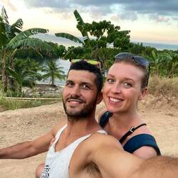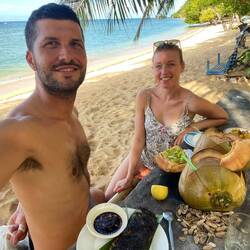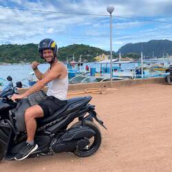 Auf unserer Fahrt erkunden wir mal wieder als weit und breit einzige Touristen das Landesinnere🙋🏽♂️🙋🏼♀️ Wir fahren und fahren bis wir es auf einmal komisch finden, dass die Sonne im Osten untergeht… 🤔 Liegt wohl daran, dass wir die falsche Abzweigung genommen haben und nun doch auf der Westseite der Insel sind 🙄 Wir beschließen zurück zu fahren und merken dann, dass die Straße Richtung Osten gesperrt war und wir deswegen falsch gefahren sind. Als wir trotzdem passieren wollen, halten uns einige Einheimische auf. Ok dann nicht… 😒 also wieder zurück Richtung Westseite und wir nehmen eins der wenigen günstigeren Hotels, da es nun bereits dunkel geworden ist 🫥 Das „Summerville Hotel“ kostet nur 17€ statt 40-50€ die Nacht und wir wollen einfach nur schlafen 😴 Internet gibt es übrigens so gut wie nirgendwo auf der Insel und anscheinend schon gar nicht mit unserem Mobilfunkanbieter 📵 Der Morgen mit Yoga und Frühstück am Pool fängt gut an und wir freuen uns auf die nächste Erkundungstour mit dem Roller 🛵 Wieder geht es gen Norden und nach bereits 30 Minuten fahren wir nur noch auf Schotterstraße. Wir peilen einen Strand an, wo wir vermuten wenig bis gar keine Touristen anzutreffen 🏝️ Bingo! Der „Alito Beach“ betrieben von einer kleinen Familie hat außer vier anderen Touristen wenig Besucher und wir erholen uns von dem staubigen Ritt bei frischen Kokosnüssen, Fisch und Früchten unter den Palmen 🌴 So haben wir uns die Philippinen vorgestellt, wenn da nur nicht die Rückfahrt wäre 😩 Hauptsache wir fahren nicht im Dunkeln und so geht es direkt in unsere morgens gebuchte Unterkunft „Cocovana Beach“. Dort haben wir eine kleine Hütte fast direkt am Wasser, aber leider im Hostel-Style, sodass wir keine eigene Toilette im Zimmer haben 🚽 😑 Nun gut für eine Nacht soll es gehen. Romain macht sich schnell bereit für sein Meeting, muss dazu aber wieder 1,5 Stunden zurück in die Stadt fahren, da auch hier, trotz guter Bewertungen, der Internet-Empfang katastrophal bis nicht existent ist 😥 Ich beobachte derzeit die Glühwürmchen in den Mangroven am Meer und schreibe diese Zeilen 🥹