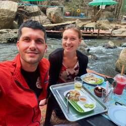 Du coup on repart dans la nature explorer les environs… on rencontre meme des éléphants dans certains enclots, avec de forts doutes sur la manière dont ils sont traités 😰. On fait une halte dans l'un des petits restaurants juste au bord de la rivière 🏠 Endroit à premiere cue sympathique avec tables en bambou au dessus de l’eau. C’était dans compter sur les moustiques affamés et la piètre qualité du service et de la nourriture: cher, petites portions, pas bon et on se fait presque foutre dehors car la journée 😅 Expérience rare en Thaïlande, car normalement la nourriture et le personnel sont tout simplement géniaux ! 👍🏻