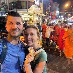 Am Morgen werden wir bereits um 7 Uhr als erste von 7 Teilnehmern mit dem MiniVan 🚐 abgeholt und es geht zur „Elephant Freedom Village“ Organisation 🐘 Dieses Projekt zum Schutz von Elefanten liegt ca. 2 Stunden entfernt. Wir erhalten erst eine kleine Einweisung in die Geschichte der Elefanten und dann kommen die großen Dickhäuter schon angelaufen. Wie diese sonst gemütlichen Tiere auf einmal rennen können, als sie das Essen wittern, welches wir ihnen reichen dürfen 😅 🍌🎋 Alle benehmen sich sehr gut außer Ciara, das Elefanten-Baby, welches noch keinerlei Training hatte 😅 Wir können bestätigen, dass es den Elefanten an nichts fehlt und sie alles andere als scheu, ängstlich sind oder in schlechten Bedingungen zu leben scheinen 👍🏻 So geht es eine Runde Spazieren, Schwimmen und natürlich Fotos machen mit den riesigen Tieren 📸 Manchmal grenzwertig, müssen die Elefanten das über sich ergehen lassen, aber alles mit Belohnungen (Essen) und natürlich keinerlei Strafen. Das beruhigt unser doch teilweise schlechtes Gewissen 😏 Nach dem Mittag geht es wieder auf die wackelige Rückfahrt und wir werden leider als Letzte in unserem Hotel abgeliefert 🏨