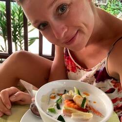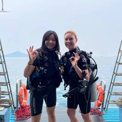 Wir sind insgesamt 4 Schüler 🙋🏻♀️🙋🏼♀️🙋🏻♂️🙋🏼♂️ Zwei Frauen (Emilyn und ich) und zwei „Männer“ (Keeihran und Max - beide keine 25). Emilyn und ich haben uns quasi schockverliebt ineinander 😍 Wir waren wortwörtlich nicht nur beim Tauchen auf einer Wellenlänge und haben uns wahnsinnig toll beim Abendessen oder in den Pausen unterhalten 🤩 So verbrachten wir in unserer Gruppe auch die restliche Freizeit neben den Tauchgängen und probierten die thailändische vegane Küche von Koh Tao 😋