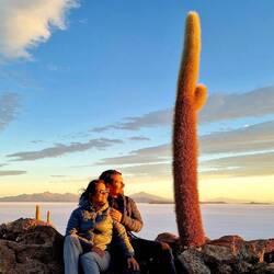 Der letzte Stopp für heute ist die Isla Incahuasi, eine "Insel" im Zentrum der Salzwüste wo riesige Kakteen wachsen. Wir erklettern den höchsten Punkt und geniessen von hier aus den Sonnenuntergang und die Aussicht auf diese magische Landschaft.Leia mais