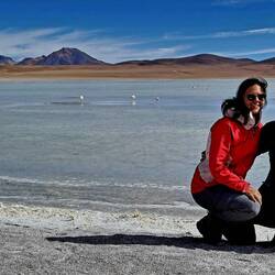 Auf dem weiteren Weg stoppen wir bei mehreren Lagunen, wo wir Flamingos beobachten. Besonders beeindruckend für uns ist die magisch anmutende Laguna Colorada. Wir sehen junge Flamingos, die zu unserem Erstaunen nicht pink sondern braun sind, und Carlos erzählt uns, dass die Pinke Farbe erst später durch die Nahrung kommt.