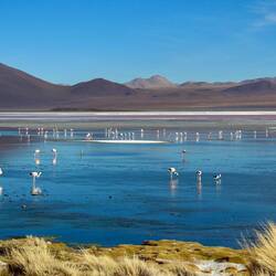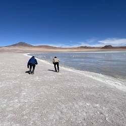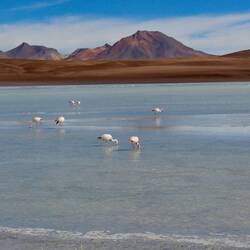 Auf dem weiteren Weg stoppen wir bei mehreren Lagunen, wo wir Flamingos beobachten. Besonders beeindruckend für uns ist die magisch anmutende Laguna Colorada. Wir sehen junge Flamingos, die zu unserem Erstaunen nicht pink sondern braun sind, und Carlos erzählt uns, dass die Pinke Farbe erst später durch die Nahrung kommt.