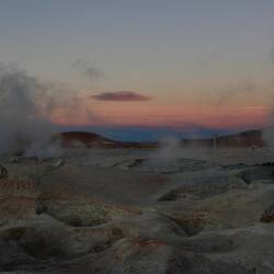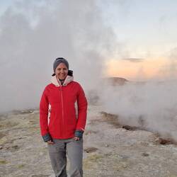 Gegen Ende des Tages erreichen wir mit 5200 Höhenmeter den höchsten Punkt unserer Tour auf einem Vulkan, die Sol de Mañana Geysire. Überall zischt es und es liegt ein Schwefelgeruch in der Luft. Es ist beeindruckend, wie nahe wir an die Dampfwolken herantreten können wo man sozusagen direkt in die brodelnde Erde hinabblickt.