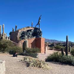 Der Bus nach Salta fährt erst am Nachmittag. Wir machen uns nach dem Frühstück wieder auf den Weg zum Geldautomaten, nur um festzustellen, dass die Schlange nun noch länger ist als gestern. Wir erkunden stattdessen noch ein bisschen Humahuaca, das mit seinen Wandgemälden, der charmanten Kirche und der tollen Landschaft einiges zu bieten hat. Besonders beeindruckend ist das Monument zum Gedenken der Helden des argentinischen Unabhängigkeitskrieges, das über 300 Treppenstufen erreichbar ist und an dessen Spitze ein 9m hoher indigener Krieger steht.