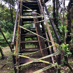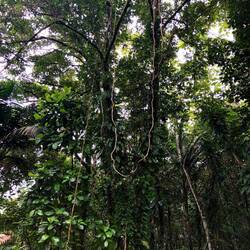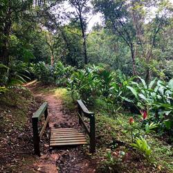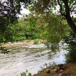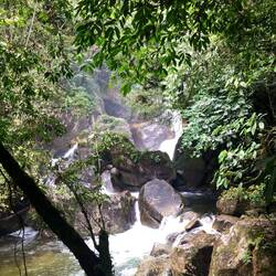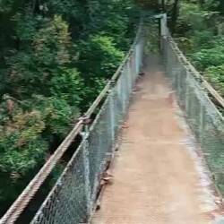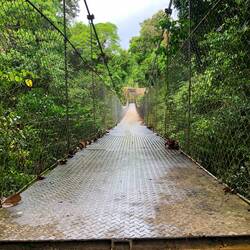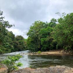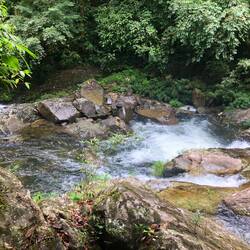 Ich dachte mir, ich lauf jetzt einfach mal weiter… Über eine kleine Brücke und rechter Hand war dann ein Fluss, in dem anscheinend auch gebadet werden kann. Ich bin zum Ufer, Badesachen hatte ich keine mit und der Regen setzte auch grad wieder ein. Kurze Pause am Fluss und dann ging die Suche nach dem Wasserfall weiter. Nach nicht mal 100 Meter war ein Trampelpfad, den musste ich nehmen. Irgendwie war’s schon ein bisschen komisch, so ganz alleine in der Gegend. Am Ende des Pfades waren Stufen zu einer, mehr oder weniger, Hängebrücke. Nach kurzer Überlegung bin ich dann drüber gegangen. Wieder auf nem Trampelpfad weiter, bis ich zum nächsten Fluss kam, den ich überqueren muss. Hier war dann Schluss für mich. An der Stelle, wo ich ne Möglichkeit gesehen hätte, war am Baum überall Stacheldraht. Ich drehte, auch wegen der Uhrzeit, um.