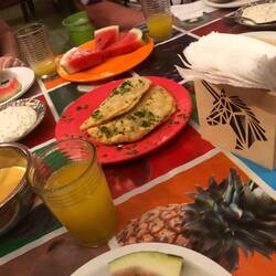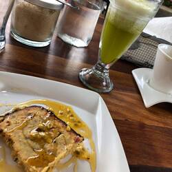 Erst geduscht, dann auf der Terrasse gechillt, das Hostelgelände begutachtet und dann ab in die Hängematte. Nach drei Stunden bin ich Richtung Santa Fe Coffee Shop aufgebrochen und hab mich auf was Süßes und nen Kaffee gefreut. Aber wie so oft auf dieser Reise, zu früh… Das Café hatte heute oder für immer, war nicht genau zu erkennen, geschlossen. Das Café in das ich gestern wollte, hatte nicht den Anschein erweckt, dass es heute geöffnet wäre. Ich hab dann ne Bäckerei in G…..Maps gesehen und bin auf dem Weg dorthin über ein Restaurant „gestolpert“. Dort waren ein paar Bilder vom Essen an der Straße. Hat im ersten Moment nicht besonders ausgeschaut. Bin dann trotzdem rein und hab nach Kaffee und Kuchen gefragt. Kaffee war kein Problem, was Süßes hatte sie nicht unbedingt, nur die Nachspeisen von der Karte. Zur Auswahl etwas mit Schoko und ich weiß nicht genau was, so ne Art Kuchen. Ich hab mich für „weiß nicht was“ entschieden. Das kann sie mit Lulo, Passionsfrucht, Honig usw. machen. 10-15 Minuten sollte es dauern. War dann ein bisschen länger, aber das warten hat sich gelohnt. Lauwarmer Kuchen mit Kaffee aus Boquete, da fahr ich wahrscheinlich auch noch hin. Ich hatte beim Kaffee die Wahl zwischen Espresso oder Medium. Bevor ich mich entscheiden musste, durfte ich daran riechen. Der Espresso duftete schon sehr stark, ich nahm den Medium. Außerdem bestellte ich mir noch einen frischen Lulo Saft. Lulo ist eine Frucht, die ich aus Kolumbien kenne. Der Saft war super lecker.