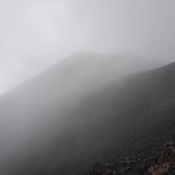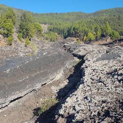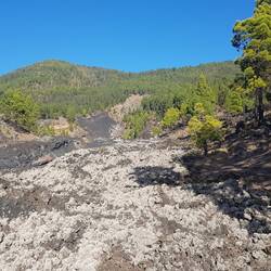 Heute geht es durch lichten Kiefernwald steil bergauf. Ich schaue in ein unergründlich tiefes Loch in der Erde und überquere breite Ströme erkalteter Lava, die alles unter sich begraben hat und aufLäs mer
