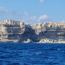 Als Flottille laufen wir gemeinsam in den schmalen Fjord nach Bonifacio ein. Das Fahrwasser ist schmal aber unproblematisch. Mir fehlen die Adjektive, um die Schönheit dieser Location angemessen zu beschreiben. Kein Wunder, dass es hier in der Saison sehr schwer ist, einen Liegeplatz zu bekommen. Laut Tornführer kann man nicht telefonisch reservieren, Peters Versuch dies trotzdem zu tun scheitert auch. Uli meint, das dies trotzdem möglich ist, wenn man es morgens um 11 Uhr versucht. Der Rat der erfahrenen Korsikasegler lautet: In der Hauptsaison morgens bis elf Uhr ankommen, da dies die Uhrzeit ist, bis zu der die Hafenlieger entweder ablegen oder sich zum Bleiben entscheiden müssen.