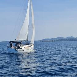 Leider erreicht die Windstärke heute maximal 3Bft, wir üben trotzdem Mann-über-Bord-Manöver. Alle sind sich einig über das Beste Manöver: Sofort eine Wende, Genua back stehen lassen, Großschott los, voll Gegenruder, mit dem Motor die Fahrt raus nehmen und dann mir dem Motor vor und zurück so manövrieren, dass Boje/Person hinten aufgenommen werden können. Beste Zeit für das Manöver: knapp über zwei Minuten.