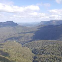 Ein blauer Horizont aus Eukalyptusbäumen, der schier endlos erscheint – die natürliche Schönheit des Weltnaturerbes Blue Mountains.