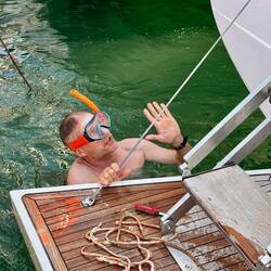 Das Wetter ist wolkenlos, schon am morgen früh sehr warm. Wir geniessen den ersten Kaffee aus unserer Nespresso-Maschine, führen das Törn Briefing durch und lösen die Leinen um 10 Uhr mit ZielLæs mere