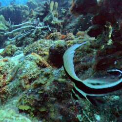 By mid-afternoon, we decided to take advantage of the spare tanks for a shore dive. Geared up and in the water by 4 p.m., we casually glided to the reef edge and descended to 19 meters. Heading south into a gentle current, we soon encountered an old sunken boat. Not long after, we spotted a small sea turtle, followed by a large moray eel weaving through the reef. We also saw a couple of lionfish and two flounders near the end of the dive.