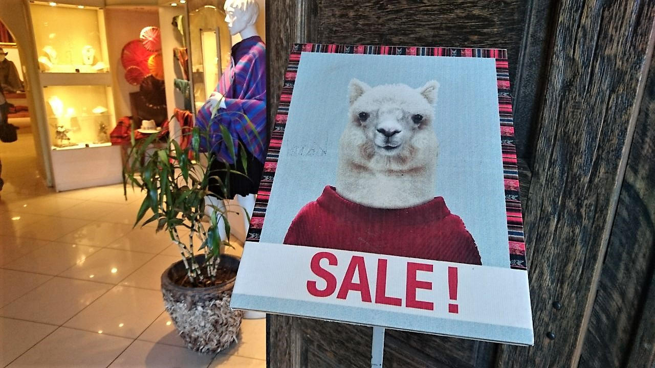 Herausforderung: Bei diesen tollen Farben und Mustern von Stricksacken und den unheimlich goldigen Testimonials (Lamas, Alpakas siehe Bild) nicht in den Kaufrausch verfallen.