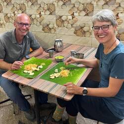 zum abschluss im homestay gleich zwei spezialitäten zum frühstück, puttu und dosa neer, wir werden verwöhnt und werden es vermissen…
