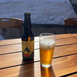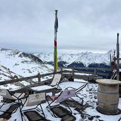 lässig: tolles frühstück, blauer himmel, bergpanoramas, schneebedeckte strasse bis weit runter, bier und essen auf der sonnen-‚terrasse‘…