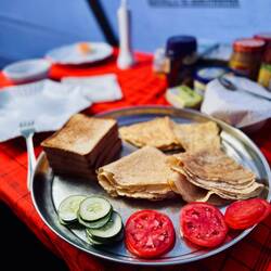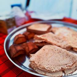 Der Tag hätte besser nicht starten können: die Sonne hat uns schon vor 7 Uhr mit ihren warmen Strahlen beglückt und wir haben unseren Essensbringer (es bringt wirklich immer der gleiche junge Herr das Essen ins Zelt) gefragt ob wir draussen mit Blick auf den Mont Meru Zmörgelen dürfen. Was eben sehr gut ist: es werden uns immer alle Wünsche erfüllt, so auch dieser! Es war herrlich und die Crepes mit Peanut Butter (mittlerweile auf 3900m nicht mehr ganz so smooth wie angeschrieben) und Fotzelschnitten mit Honig waren nie besser!