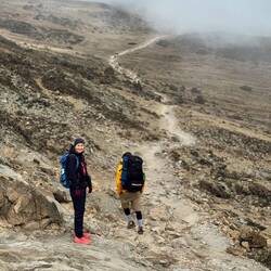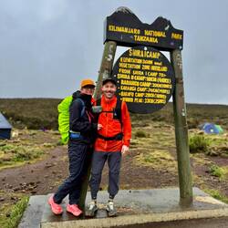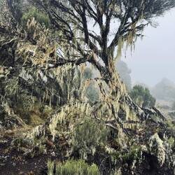 Um 07:15 hat unser Koch uns wie jeden Morgen ein reichliches Frühstück serviert. Danach gings um 08:00 Uhr los in Richtung Shira II Camp. Wir fühlen uns bestens und so konnten wir rund 2 Stunden die eher flachen Kilometer geniessen und uns mehr mit uns als mit dem Guide unterhalten (Godson ist tendenziell nicht der Mann der grossen Worte und Dickson/Dixon/Digson (wir wissen es immer noch nicht) läuft meistens rund 30 Meter hinter uns als Besenwagen her). Die letzte Stunde hat es sich das Wetter dann wieder anders überlegt und wir kamen erneut etwas durchnässt im Camp auf 3‘850 hm an. Wir müssen ehrlich sein, es wäre schon schön auch mal bei gutem Wetter anzukommen und nicht gerade ins Zelt flüchten zu müssen. (Eine Bitte daher an dieser Stelle: könnt ihr bisseguet unsere Wetterwünsche auch noch in eure Gebete aufnehmen? Das wäre sehr lieb und würde der Stimmung im Shira II gut tun🫠)