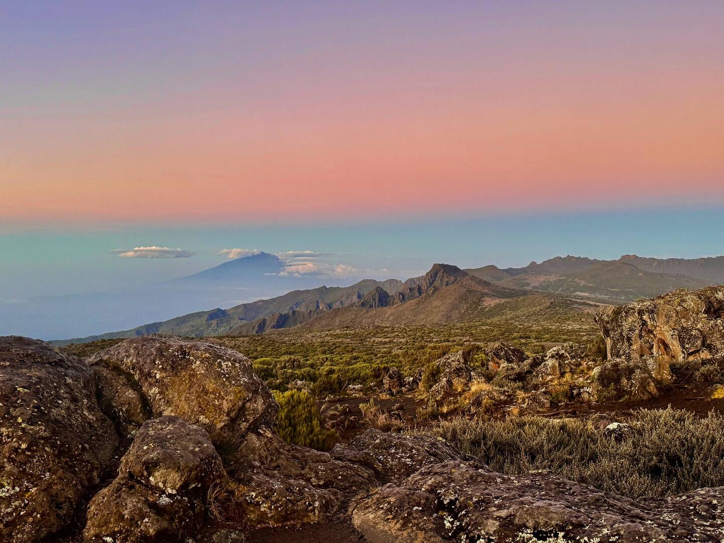 Am Abend hat es wieder aufgerissen und im Sternenmeer konnten wir in der Ferne zum ersten Mal den Kilimanjaro sichten. Am Morgen war es zu unserer Freude immernoch schön und wir konnte mit Blick auf den Kili die Sonne geniessen. So war es trotz Morgenstund und Höhenlage richtig schön warm. (Das bedeutet, dass wir nun auch Sonnencreme einschmieren mussten und das ist bekanntlicherweise keine Wohltat🙄🥴 aber Sonnenbrand wäre das ja auch nicht, von daher konnte ich auswählen zwischen Pest und Cholera..🙄)