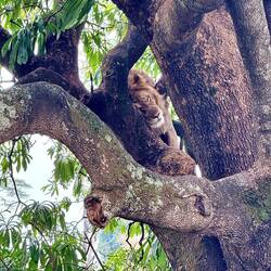Zum Abschluss durften wir sogar noch einen Löwen auf einem Baum „spotten“ der sich zu einem Nickerchen dorthin verzogen hatte. Nach dem Motto „the lion sleeps tonight“😉 (was ich heute übrigens auch noch gelernt habe und ich mässig cool finde, dass die Weibchen die Beute jagen aber dann die Männchen als erstes essen dürfen.. wieso? Das möge mir mal einer erklären… die Männchen wollen wohl bei der Jagd ihre schöne Haarpracht nicht ruinieren und können so unmöglich mitarbeiten! Zum Glück hat Fabian einen Glatzen - sonst würde mich es beim Kochen „ad Schnure preiche“ und das möchte nun wirklich niemand!!)