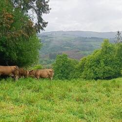 Entered Galicia! Ate lunch in a restaurant, a super delicious fish soup, with white wine, and shared a Pastel de A Fonsagrada dessert with Frank and Jürgen. Jürgen's dessert, that is to say, with three forks. (I'm gonna try that recipe at home; will you come and share it? Basically butter, eggs and almonds, with a splash of cognac. Soooo good.) AND Jürgen paid for my meal!