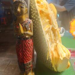 We have had two fascinating days in this busy local-plus-tourist town: quite a contrast with the places we have spent the last month visiting in Malaysia. Apart from anything, we are far enough north and east to be in a very dry heat, so we are just 'hot', without the sweltering and sweating. The days are longer, although night still falls like a curtain at performance end. The place lives on the tourism, with more whites roaming the streets than in all the places we have been in, and a huge amount of tourist tat (cartoon elephants, buddhas, tshirts, bracelets, you know the sort of thing) piled up in stall or store after stall and store. And constant whiny voices pleading for attention and purchases, with great disappointment - or resignation - if you pass by. Some of the art and craft is also really lovely, the fabrics and matting/ wicker especially. I do wonder how they can afford the stock purchase in the first place, when so many shops are selling so very little on any given day. And I do regret buying a Patagonia rucsac in tidy, expensive England when I see shop after shop selling the same product for a third of the price here. Either over-stock or very very convincing reproductions!