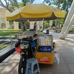 Tiffin Rooms - another joke: the famous Emmerson's Tiffin Rooms, opened by my g-g-grandfather in 1866, were located in buildings now no longer in existence. In her tour guiding 'reccy' Christine had spied an ice cream man with his little ice cream stand, just on the north side of the Cavenagh Bridge, and decided to declared this to be as close as anyone can tell to the original restaurant. She confused the poor little man by asking if he sells tiffin ice cream; but for S$1.50 I did buy a yam ice cream, the most unusual flavour available.