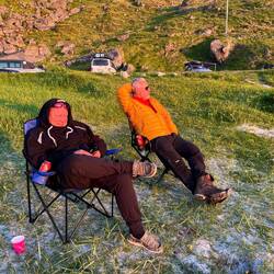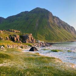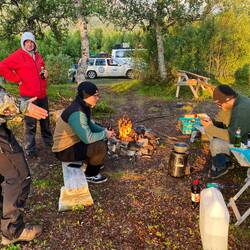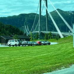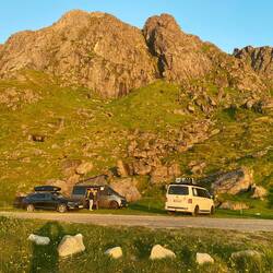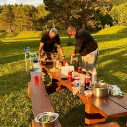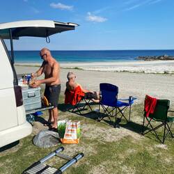 ….. Tromsoe erreicht und Macks Brauerei besucht, danach ging es weiter über 2 Fähren in Richtung Nachtlager. Beim warten vor der Fähre noch schnell Essen gemacht. Steaks gebraten.