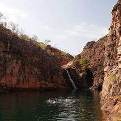 Im Anschluss gibt es wieder eine Abfolge von kurzen „Wanderungen“ und erfrischenden Bädern in Wasserfällen. Zuerst die Florence Falls, an denen wir dank kurzer Distanz und frühem Aufstehen fast die ersten sind. Wenn man unter dem Wasserfall durch schwimmt, ignoriert, dass man fast nicht mehr atmen kann, und dann nach oben blickt, wird man belohnt mit einer überwältigend schönen Szenerie aus Felsen, sanftem Grün und in der Sonne glitzernden Wassertropfen. Als zweites dann das Buley Rockhole, wo uns Nate zu einem versteckten Badeplatz führt, den wir ganz für uns haben. Zum Schluss dann noch die Wangi Falls: voller Touristen, irritierenderweise viele davon mit Schwimmnudeln, aber ebenfalls wunderschön und sehr groß, so dass wir noch mal ausgiebig schwimmen.
