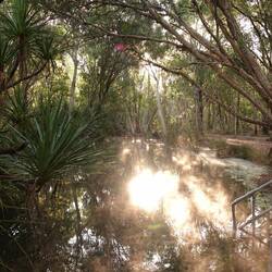 Vor dem Einschlafen hatte ich mir ausgerechnet, dass ich es noch vor dem Check-Out zu den Bitter Pools schaffen würde, wenn ich um 6 Uhr aufstehe. Und zack - Punkt 6 Uhr bin ich wach und voller Tatendrang. Es ist herrlich. Kurz vor Sonnenaufgang ist es hier, anders als rund um Darwin, noch angenehm kühl. Ich bekomme sogar kalte Hände und laufe zügig. Unterwegs besorge ich mir noch schnell online einen Nationalparkpass, damit auch alles seine Ordnung hat. Nach knapp 3 km erreiche ich den Elsey NP und kurz danach die Bitter Springs. Ich bin die erste und genieße die Ruhe und die magische Stimmung mit dem über dem warmen Wasser aufsteigenden Dunst. Kurz nach mir kommt ein nettes Paar mit niederländischen Wurzeln an, so erhalte ich ein paar Tipps und Warnungen vor im Wasser versteckten Baumstämmen. Das war’s dann aber auch mit menschlichen Besuchern.