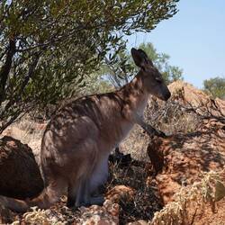 Den Namen hat die Insel von Matthew Flinders, dem die damals noch extrem zahlreichen Kängurus auffielen. Aus ihrem geringen Flucht Reflex schloss er richtigerweise, dass er auf einer Insel gelandet ist. Das erste, was er mit ihnen machte, war allerdings, 35 davon für Frischfleisch zu schießen. Und damit sollte er nicht der letzte sein. Es wurden in der Folge zigtausende Kängurus und Robben (für Öl, Fell und Leder) abgeschlachtet und eine Emu Art ausgerottet (das letzte Exemplar steht heute ausgestopft in Paris). Wir sehen trotzdem einige Kängurus unterwegs, halten allerdings nicht für sie an. Sie sind schokobraun und Dave zufolge die bestaussehendsten Kängurus Australiens. So viel Vergleich habe ich noch nicht, aber hübsch sind sie schon.