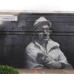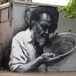 Das Kunstwerk von Tim Bowtell zeigt das Porträt von Urquhart „Scotty“ Allan, einem schottischen WW1 Piloten und späteren Quantas Manager. Die Catalina Aircraft wurde vor allem im zweitenLeia mais