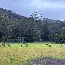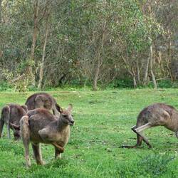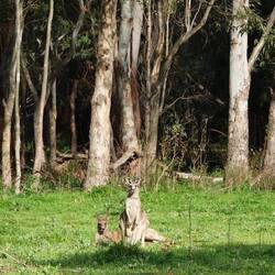 Nach dem Schreck mit dem Sturz vorhin gibt es heute Abend nur noch entspanntes Programm. Ich gehe ein wenig in der Nähe des Bambruk Cultural Center in Halls Gap spazieren, wo jede Menge Kängurus undLeia mais