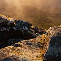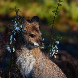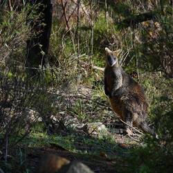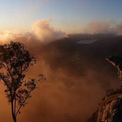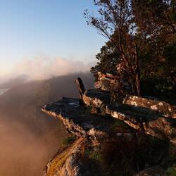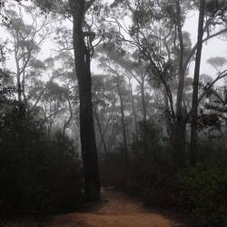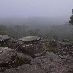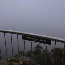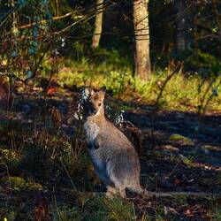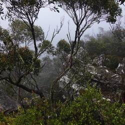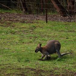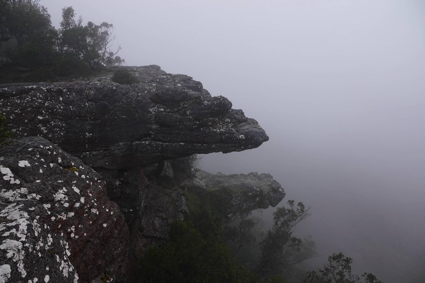 Anscheinend bin ich wieder etwas tiefer. Im dichten Nebel, (oder sind es Wolken?) ist die Sicht gleich null. Trotzdem ist es eine wunderschöne Miniwanderung (2 km) mit einem Wallaby.