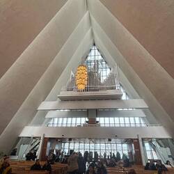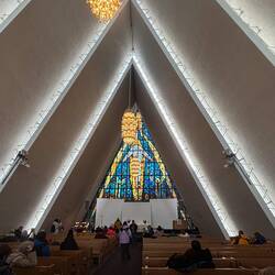 Um kurz nach sieben wache ich das erste Mal auf. Draußen ist strahlender Sonnenschein, aber ich habe erst 4 Stunden geschlafen, also drehe ich mich noch mal um. Als ich gegen neun Uhr aufstehe, ist der blaue Himmel schon fast wieder weg. Nach einem schnellen Frühstück mache ich mich auf den Weg auf das gegenüberliegende Ufer zur Eismeerkathedrale. Der Reiseleiter einer deutschen Gruppe gibt dort gerade ein Pfeifkonzert. So kann ich die fantastische Akustik wahrnehmen. Die Kathedrale ist hübsch, aber man hat auch nichts verpasst, wenn man sie nicht gesehen hat.
