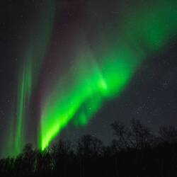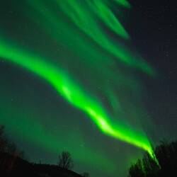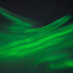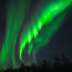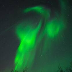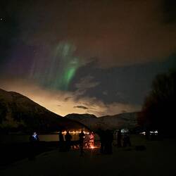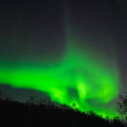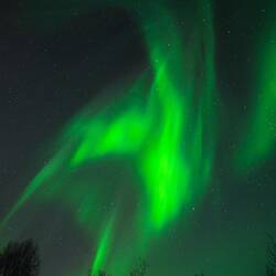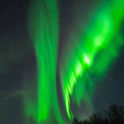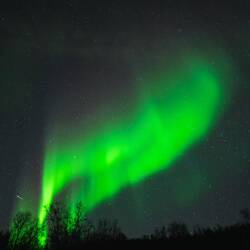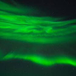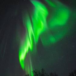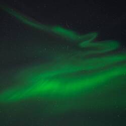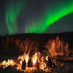 Das Nordlicht ist so intensiv, dass wir ganz schnell aus dem Bus rausgejagt werden - ohne die versprochenen Thermoanzüge, Hand- und Fußwärmer. Und dabei bleibt es auch, denn die Lichter verändern ständig Form und Intensität, und es gilt, nichts zu verpassen. Zwischendurch gibt es Suppe und heiße Getränke am Lagerfeuer, aber das Feuer beeinträchtigt die Sicht, und richtig wärmen tut es auch nicht in dem freigeschaufelten Schneerund. Also wieder zurück in die Kälte, wo die Aurora noch mal zu Höchstform aufläuft.
