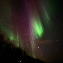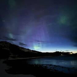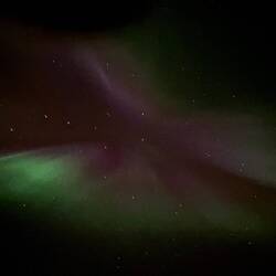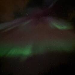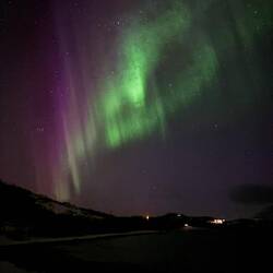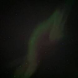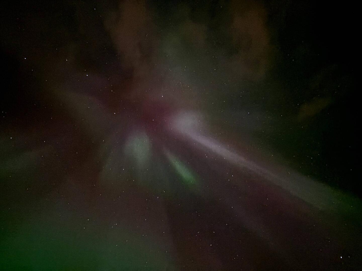 Ich hatte da nicht mehr mit gerechnet und mich schon auf einen sehr frustrierend Abend eingestellt, doch nach etwa einer halben Stunde hört der Regen auf. Langsam zeigt sich in der Ferne eine kleine Wolkenlücke, die sich zunehmend in unsere Richtung ausbreitet. Und da ist auch schon das Nordlicht. Mit bloßem Auge ist es deutlich schwächer und blasser als am Vortag, aber die Kamera offenbart große Anteile an, pink und rot. Es wird stärker und schwächer, geht aber nie ganz weg. So langsam bekomme ich ein Gefühl dafür, wie ich bei Nachtfotos den Fokus meiner Kamera bedienen kann. Gestern war noch sehr viel Ausschuss dabei, heute wird es etwas besser (hoffe ich zumindest, genau weiß ich das erst, wenn ich die Bilder zu Hause auf dem Rechner anschaue.). Mit den Tipps von Alba werden aber auch die Fotos mit meinem Handy immer besser (siehe unten).