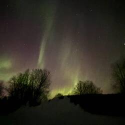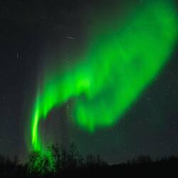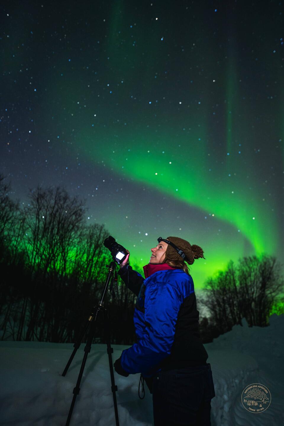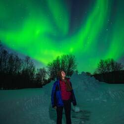 Bogdan ist selbst am begeistertsten und ruft ständig die Himmelsrichtung aus, in die zu schauen sich am meisten lohnt. Die Kamera sieht alles natürlich viel intensiver als unser Auge, aber die Säulen, Spiralen und Schleier sind auch mit bloßen Augen ein faszinierendes Naturspektakel. Die Lichter sind so intensiv, dass wir zeitweise sogar einen grünen Schimmer auf dem Schnee ausmachen können.