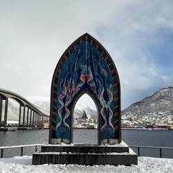 Ich bin hier des Nordlichts wegen. Nun muss ich irgendwie die Tage herum bringen. Heute mache ich einen Stadtrundgang durch Tromsö. Der Zustand der Gehwege stellt mich wirklich vor Herausforderungen. Ich hoffe, ich schaffe es ohne größere Stürze. Es ist schon so mild, dass der Schnee an vielen Stellen geschmolzen ist und große Pfützen gebildet hat. Denen muss ich aus dem Weg gehen, denn ich habe keine wasserdichten Schuhe. Zwischen den Pfützen liegt noch Schneematsch, der sich größtenteils in eine spiegelglatte Eisfläche verwandelt hat, die nur gelegentlich durch kleinere Mengen von Split unterbrochen wird. Durch dieses Terrain wage ich mich langsam, unsicher und tastend vorwärts. Der Wind bläst so stark, dass ich befürchte, er könnte mich umwehen. Ich ärgere mich, dass ich meine Schuh-Spikes zu Hause gelassen habe. Naiverweise habe ich gedacht, dass ich sie in der Stadt nicht brauchen würde. Damit bin ich allerdings nicht alleine. Die anderen Touristen sehen kein bisschen sicherer aus als ich. Nur die Einheimischen sprinten auf Stöckelschuhen durch die Gegend.