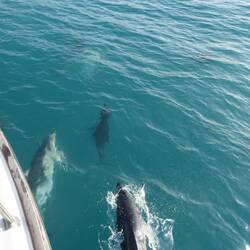 The search for dolphins began. The two boats took on a flank formation to maximise their line of sight. It didn't take very long before some dolphins were sighted jumping in the distance. Once there we went to the deck while the swimmers were released into the water. Some dolphins were immediately curious to discover the boat and swam around and under it. We didn't really know where to look. They were so many and they were incredibly playful. One really wanted to show off and did a complete round of jumping around the boat. It's hard to describe but the pure sight of them just made us happy and smile. The cool thing about this was that this was not in a controlled environment. These were wild dolphins.