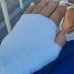 Heute morgen waren wir mit dem Boot auf einer der vorgelagerten Inseln zum Schnorcheln. Dabei bin ich mit dem Daumen auf einen Stein gefallen und jetzt ist er dick und tut weh...