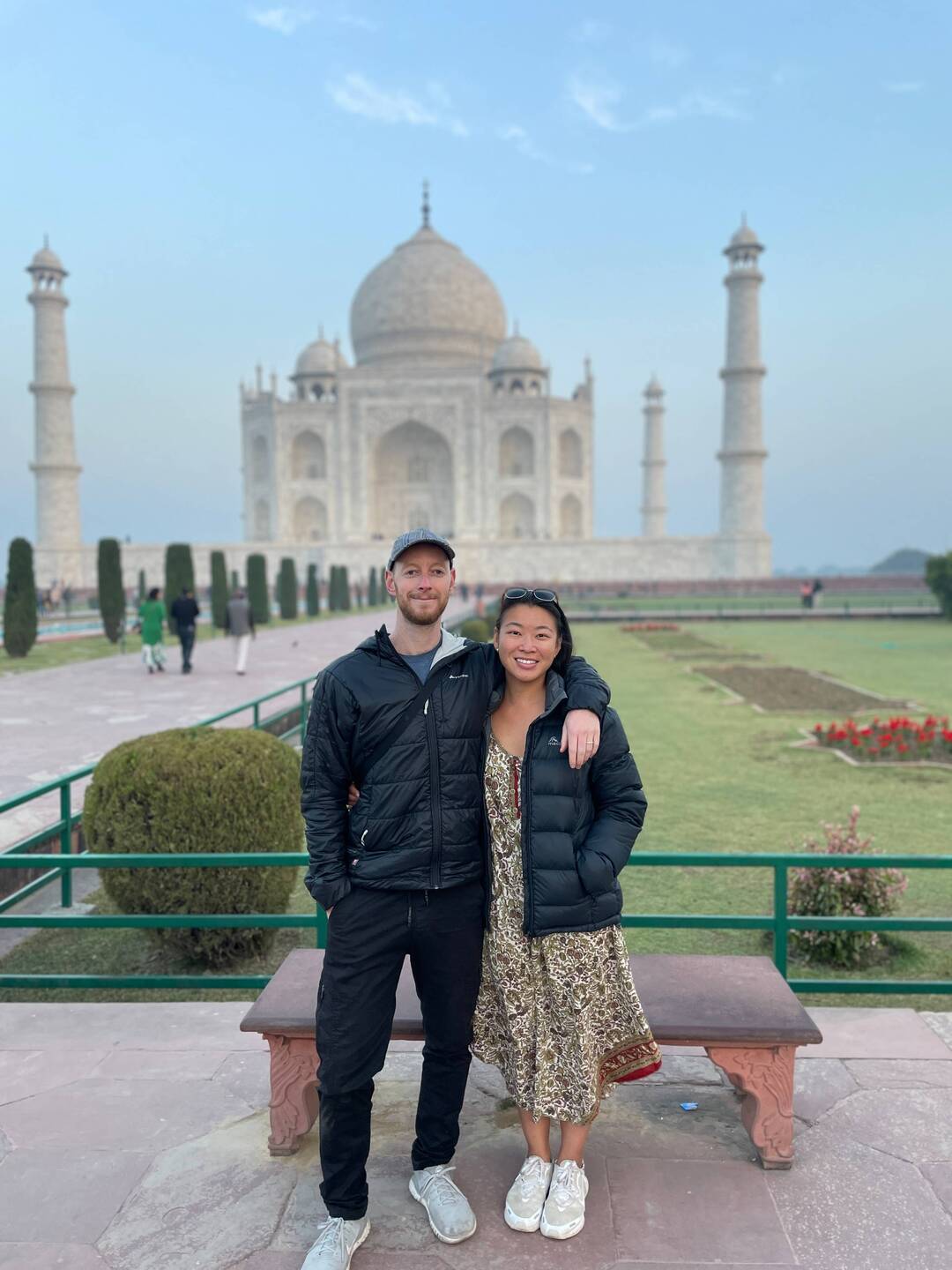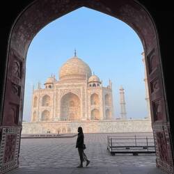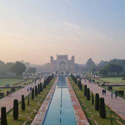 As with every other world wonder we've visited on this trip, our visit to the Taj Mahal started with an early 5am wake up call and 20min walk in the dark to the East Gate entrance. We arrived around 5.50am and were thrilled to be the first ones in line! We waited in the cold until we were let in at 6.30am. The early wake up was well worth it, as for about half an hour, we were able to view the Taj Mahal with virtually no one else around us or in any of our photos. As the sun came up, we watched as the sky turned from dark purples to light blues, and the Taj Mahal started to glow in the morning light.