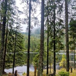 Heute frühstücken wir , der Semmelservice hat super geklappt. Es regnet am Morgen. Als es dann so halb elf aufklart, fahren wir los. Wanderung zum Schwellhäusl bei Zwiesel, Mittagessen dort.Leer más
