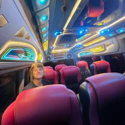 Anschließend brachte uns ein Taxi zurück zu unserem Airbnb. Hier versuchten wir, ein Grab (Taxi) nach Khao Sok (unser nächstes Ziel) zu organisieren, aber wir fanden heraus, dass sie in dieser Region nicht verkehren. Glücklicherweise gelang es unserem Airbnb-Besitzer, einen super coolen (erschwinglichen!) privaten Lieferwagen zu organisieren. Kurz darauf brachte uns unser freundlicher Fahrer nach Khao Sok. Gegen 20.30 Uhr kamen wir bei den Smiley Bungalows in Khao Sok an. Hier werden wir die Nacht verbringen.