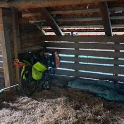 Bliebe nur das Problem mit der kommenden Nacht, Schlafmöglichkeiten sind Mangelware in der Gegend bzw. nicht sonderlich erschwinglich. Also immer stupide weiterradeln und hoffen das sich irgendwas findet, ein Heuschober, ein Unterstand oder weiß der Teufel was, Hauptsache ein Dach über mir. Zelten ist in dieser Nacht keine Option, das Zelt ist noch von letzter Nacht klatschnass und diese Nacht ist nochmal Regen angesagt.
