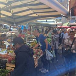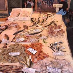 Mitten im Zentrum, eine Quertraße weit weg von der chiquen Via Etna, schlagen sechs Tage die Woche dutzende Straßenhändler ihre Stände auf. Alles was Sizilien an Köstlichkeiten zu bieten hat wird unter freiem Himmel angeboten, Einweghandschuhe und teure Kühltheken sucht man vergeblich. Ein ungeheures Treiben und durchschieben. Gerade jetzt ein wahres Paradies, die letzten Tomaten der Saison, keine schaut wie die andere aus, nicht eine ohne graue oder braune Flecken - und eine köstlicher als die andere, keine wässrigen Gewächshauskreaturen. Fisch und Meeresfrüchte in Hülle und Fülle, jeden Morgen frisch vom Hafen - der blanke Horror für alle die ihr Mini-Desinfektionsmittel am Rucksack tragen - ein Paradies für alle die sich vor den drei Bakterien mehr nicht fürchten und die Qualität zu schätzen wissen.