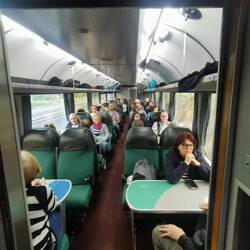 Um 7 Uhr im Port Chambers. Um 8 Uhr Treffpunkt zur Zugfahrt. 250 Leute haben sich dafuer angemeldet. Im Gaensemarsch gings um 8.30 zum Zug, der vorm Hafen stand