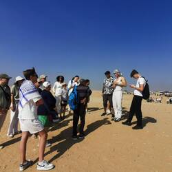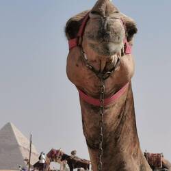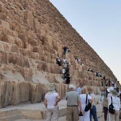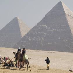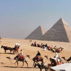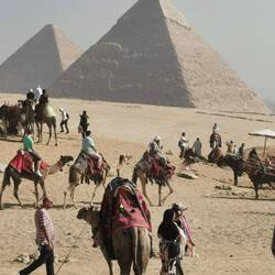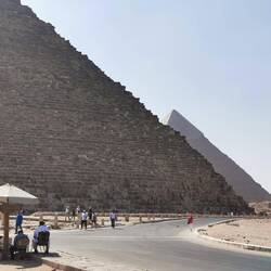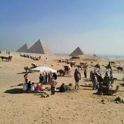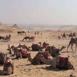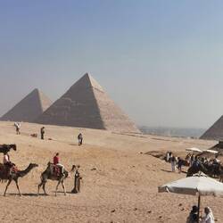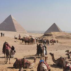 Spazieren an dutzenden Kamel treibern und vielen Touristen vorbei.